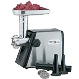 This meat grinder from Waring Pro delivers professional cuts on your countertop. Meat Grinder: 300-watt motor grinds generous portions of fresh meats quickly reverse function repositions any trapped ingredients to maximize output and make cleaning easy Includes 2 sausage attachments and 3 cutting plates. Die-cast metal hopper and brushed stainless steel housing. Imported. Available in colors: Stnlsteel.
